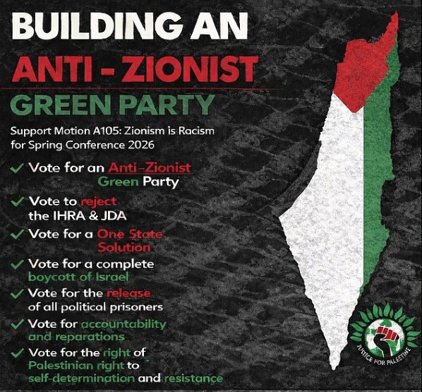 The proposal was introduced by Lubna Speitan, a British-Palestinian party member affiliated with the Greens for Palestine Steering Group and the Greenwich Palestine Alliance. In a public statement, Speitan called Zionism “the ideological underpinning of an ethnonationalist Jewish State in historic Palestine, to the exclusion and domination of the non-Jewish population.”