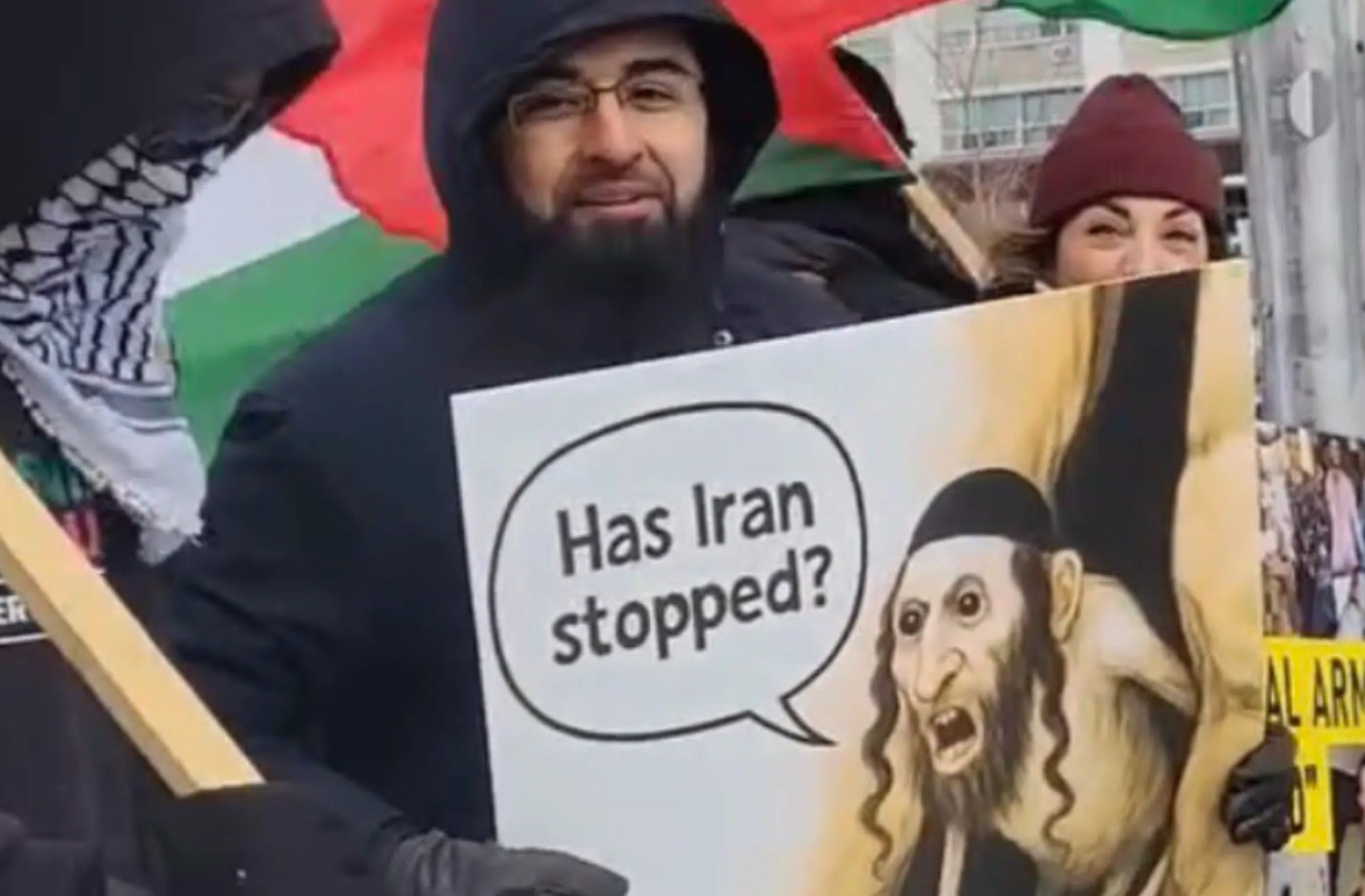 In London, demonstrators shouted, “Yalla yalla intifada” and “Death to the IDF.” A rally in Toronto featured Iranian regime symbols.