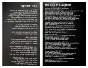 At the corridor’s end hangs a poem by Chaim Nachman Bialik, Israel’s national poet. Written after the 1903 Kishinev pogrom, “The City of Slaughter” captures the unending echo of Jewish suffering.