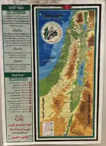 Among the displays is a series of illustrated textbooks where cartoon characters carry rifles and praise “martyrs.” Others glorify real-life terrorists — assassins, suicide bombers, and gunmen — as role models for Gaza’s children. Maps within the same books erase the State of Israel entirely, replacing Israeli cities with “Palestinian” ones to teach that Israel does not exist. These materials are not fringe; they are the official curriculum in Hamas-run schools.