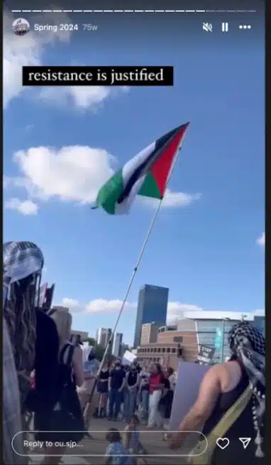 In a story posted in its highlight reel, OU SJP shared an image of Palestinian flag being carried at an anti-Israel protest, with a caption reading, “resistance is justified,” language frequently used to legitimize violence targeting Israelis.