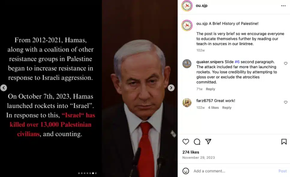 In a November 2023 post, OU SJP shared a slide that defended Hamas violence — once more labeled as “resistance” — as a “response to Israeli aggression.”